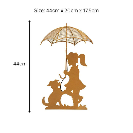 Rustic Girl & Dog Silhouette with Solar Umbrella – 44 x 20 x 17.5 CM | Outdoor Metal Garden Statue with Soft Solar Lighting