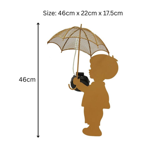 Rustic Boy Silhouette with Solar Umbrella – 46 x 22 x 17.5 CM | Metal Garden Sculpture with Solar Light