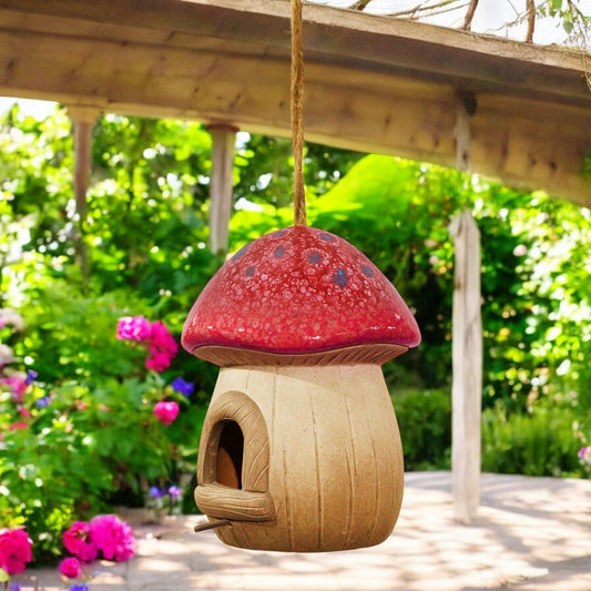 Red Terracotta Mushroom Bird House (19cm x 14.5cm x 13cm) – Decorative Hanging or Freestanding Birdhouse for Garden, Patio & Outdoor Décor – Durable & Weather-Resistant Nesting Shelter for Birds