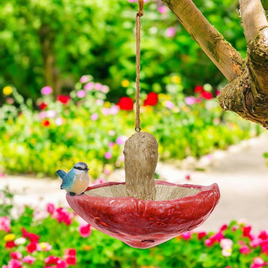 Red Resin Mushroom Bird Feeder with Blue Tit – Charming & Functional Garden Décor
