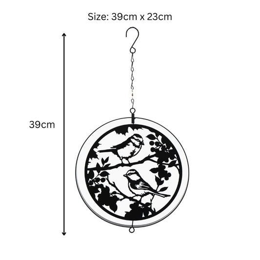 Black Metal Blue Tit Hanging Silhouette Orbit Spinner – 39cm x 23cm | Elegant Garden & Patio Décor | Wind Spinner for Outdoor Spaces