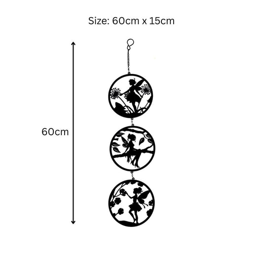 Black Fairy Silhouette Hanging Trio Spinner– 60cm x 15cm | 3-Tier Kinetic Wind Spinner for Garden & Home | Outdoor Metal Hanging Fairy
