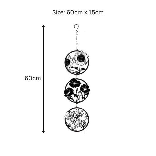 Black Floral Silhouette Hanging Trio Spinner – 60cm x 15cm | Metal Kinetic Wind Spinner for Garden & Home | Outdoor Hanging Floral Ornament
