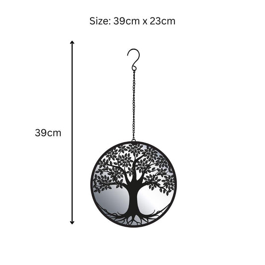 Black Tree Hanging Mirror Silhouette – 39cm x 23cm | Metal Tree Wall Art & Garden Décor | Reflective Hanging Ornament