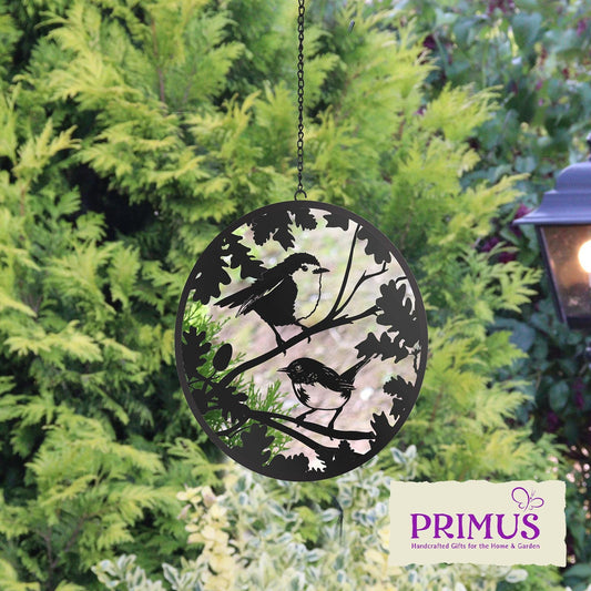 Black Robin and Wren Hanging Mirror Silhouette, Bird Wall Art for Home & Garden Décor