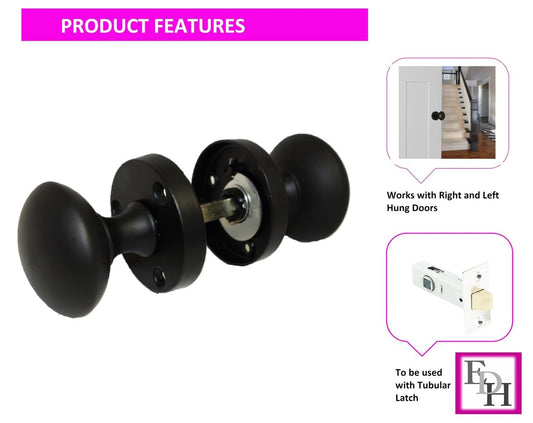 Matt Black Round Door Knob Set Including Tubular Latch - Victorian Style Sprung Internal & External Door Knobs for Mortice Locks & Tubular latches. Sets 6
