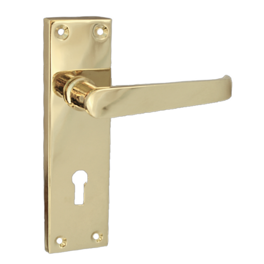 Brass Finish Epsom Victorian Scroll Lock Door Handle on Shaped Back Plate +