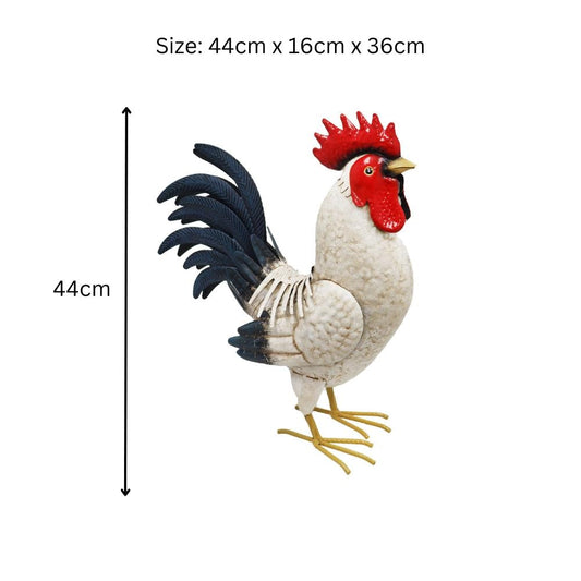 Metal White Cockerel (44cm x 16cm x 36cm) – Handcrafted Rustic Rooster Garden Ornament Farmyard Statue