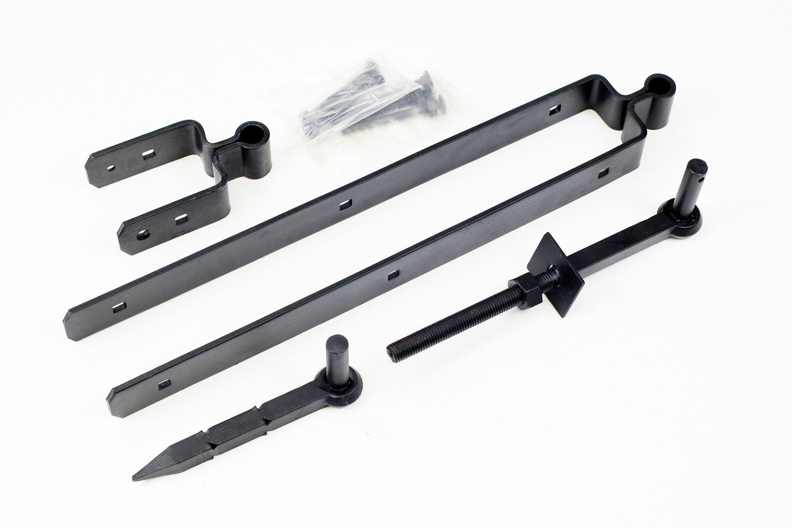 Black 450mm (18 inch) heavy field gate hinge set. Consists of 1 18" x top band, 1 x 5" botton band and 1 x 19mm dia hook to bolt and 1 x 19mm dia hook to drive. Complete with all fittings packed in polythene bag