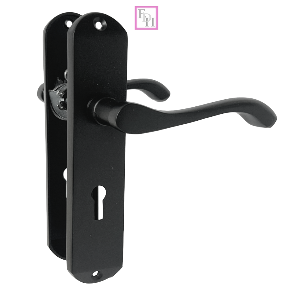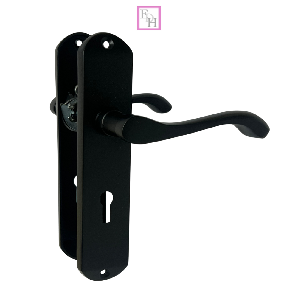Cadenza Matt Black Scroll Door Handles on Backplate – 3 Lever Sash Lock Set