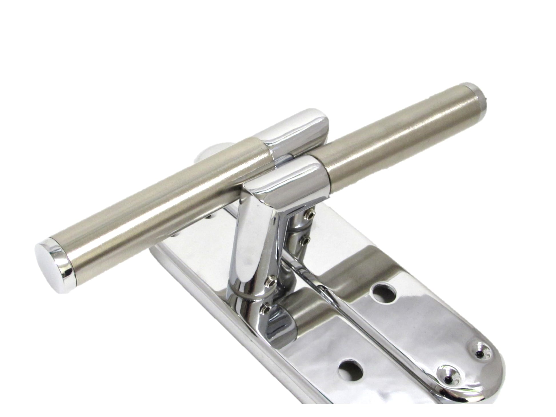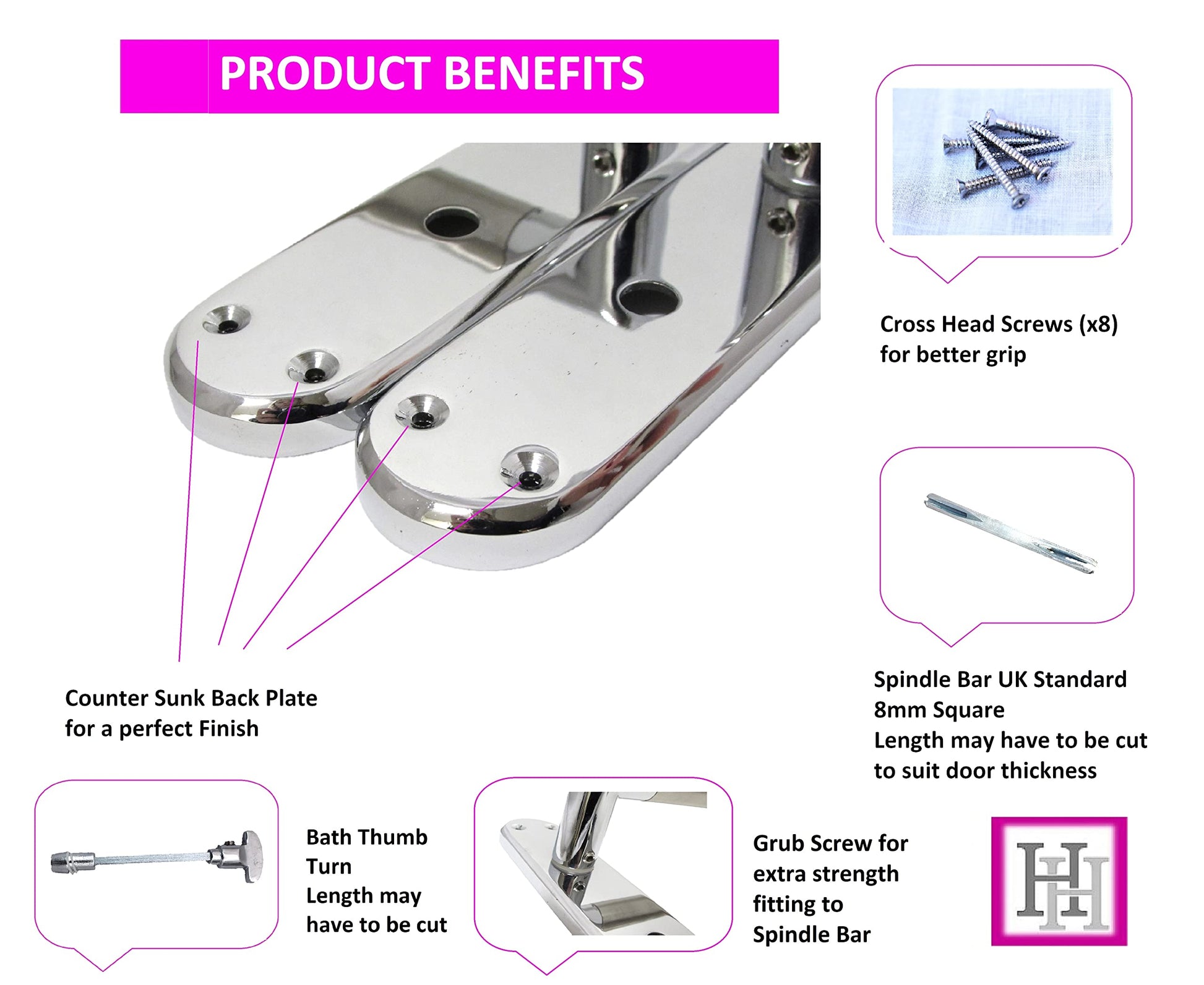 These HAVEN HERITAGE Mitred Bathroom lock chrome & satin Duo door handles are a stylish, modern feature of door furniture. They are suitable for all internal wooden door types that require a bathroom sashlock mechanism for opening and closing. Designed for effectiveness, and built to last, these silver door handles for internal doors add class and style to any interior door handles and as they are universally appealing and aesthetically pleasing. The Chrome plating on these handles have multiple layers of plating to enhance the shine and the polishing is finished off by hand to give that ultimate professional finish. The chromed layer can be decorative, provide corrosion resistance, ease cleaning procedures, or increase surface hardness . The dimensions of the backplate are approximately 179 mm x 40 mm the handle is approx 100mm with a good solid thickness that just by looking at it says QUALITY. Whether you're a professional tradesman or D I Y enthusiast in hardware for home improvements. They are an essential feature for any door, including modern and traditional homes, offices and shops. The product comes with Spindles and Screws.