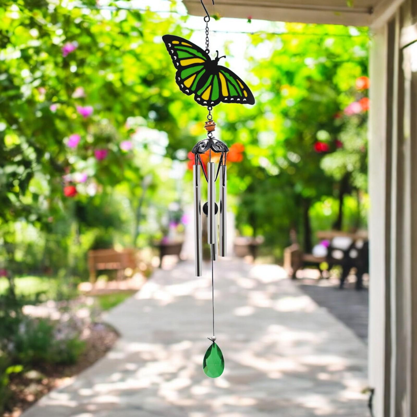 Suncatcher Green Butterfly Wind Chime (58cm x 14cm x 6cm) β Handmade Metal & Glass Hanging Chime β Outdoor Garden Ornament